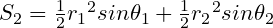 두 부채꼴의 중심각 θ₁, θ₂를 모두 구했으니, 반지름과 중심각을 이용하여 부채꼴과 삼각형의 넓이를 구할 수 있게 되었다. S₁가 두 원에서 만들어진 부채꼴의 넓이의 합이고, S₂가 두 원에서 만들어진 삼각형의 넓이의 합이면 다음과 같이 식을 쓸 수 있다.
